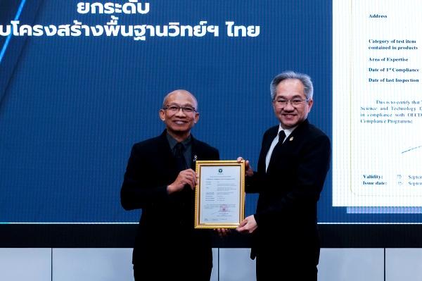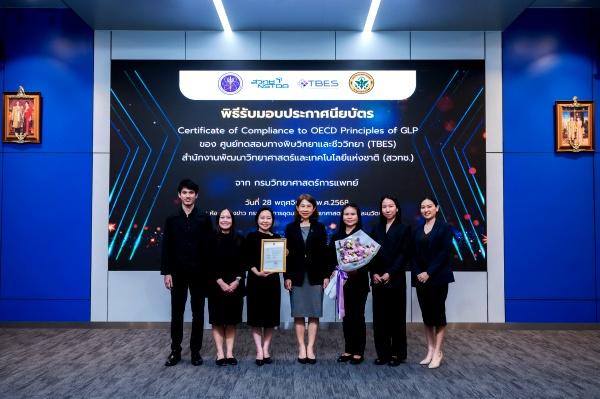 ศูนย์ทดสอบทางพิษวิทยาและชีววิทยา (Toxicology and Bio Evaluation Service Center หรือ TBES) สำนักงานพัฒนาวิทยาศาสตร์และเทคโนโลยีแห่งชาติ (สวทช.) ได้รับมอบประกาศนียบัตร Certificate of Compliance to OECD Principles of GLP (Good Laboratory Practice) ในขอบข่ายการศึกษาทางพิษวิทยา จากสำนักมาตรฐานห้องปฏิบัติการ กรมวิทยาศาสตร์การแพทย์ กระทรวงสาธารณสุข (สธ.) ซึ่งเป็นการสร้างความน่าเชื่อถือและความพร้อมของประเทศไทยในการก้าวสู่การเป็นสมาชิกองค์การเพื่อความร่วมมือและการพัฒนาทางเศรษฐกิจ (OECD) อย่างสมบูรณ์ โดย ศ.ดร.ชูกิจ ลิมปิจำนงค์ ผอ. สวทช. รับมอบประกาศนียบัตรจาก นายสุรศักดิ์ หมื่นพล ผอ.สำนักมาตรฐานห้องปฏิบัติการ ซึ่งจัดขึ้นที่ห้องแถลงข่าว อาคารพระจอมเกล้า: กระทรวงการอุดมศึกษาวิทยาศาสตร์ วิจัยและนวัตกรรม เมื่อวันที่ 28 พฤศจิกายน 2568)