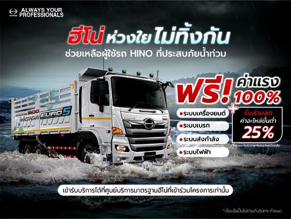 นอกจากการช่วยเหลือชุมชน สำหรับผู้ประกอบการและลูกค้าที่ใช้รถบรรทุกที่ได้รับผลกระทบจากน้ำท่วม ฮีโน่ยังจัดมาตรการพิเศษด้านบริการหลังการขายด้วยแคมเปญฮีโน่ ห่วงใย ไม่ทิ้งกัน บริการตรวจเช็กหลังน้ำท่วม ฟรีค่าแรง 100% เพื่อให้รถของลูกค้ากลับมาใช้งานได้อย่างรวดเร็วและปลอดภัย ครอบคลุมการตรวจเช็กระบบต่างๆ ได้แก่ เครื่องยนต์ เบรก ระบบส่งกำลัง ระบบไฟฟ้า ให้ส่วนลดอะไหล่กลุ่มผลิตภัณฑ์น้ำมัน เคมีภัณฑ์ ชุดติดตั้ง PTO อุปกรณ์ตกแต่ง แบตเตอรี่ ทุกขั้นตอนดำเนินการโดยช่างเทคนิคมืออาชีพจากศูนย์บริการมาตรฐานฮีโน่ โดยลูกค้านำรถเข้ารับบริการได้ที่ศูนย์บริการมาตรฐานฮีโน่ทั่วประเทศ