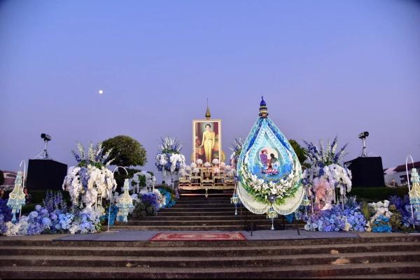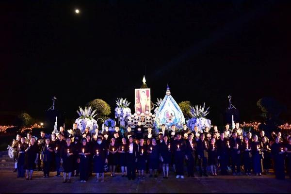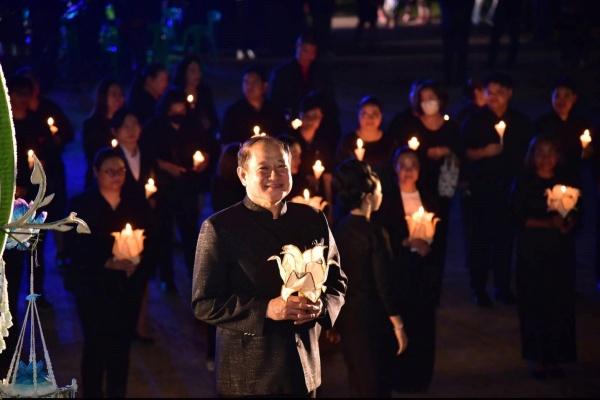จากนั้นเป็น การบรรเลงวงดนตรีสากลในบทเพลงพระราชนิพนธ์ อันทรงคุณค่า โดยคณะศิลปกรรมศาสตร์ เพื่อร่วมน้อมรำลึกในพระอัจฉริยภาพ และพระมหากรุณาธิคุณผ่านท่วงทำนองแห่งเสียงดนตรี พร้อมด้วยการสร้างประวัติศาสตร์ความอาลัยผ่าน การกล่าวสุนทรพจน์ 4 ภาษา ประกอบด้วยภาษาจีน ภาษาญี่ปุ่น ภาษาอังกฤษ และภาษาไทย ตามลำดับ โดยคณะศิลปศาสตร์ เพื่อประกาศพระเกียรติคุณให้ขจรขจายสู่สากล กระทั่งเข้าสู่ช่วงพิธีการหลักในเวลา 19.10 น. รศ.ดร.สมหมาย ผิวสอาด อธิการบดี มทร.ธัญบุรี เป็นประธานกล่าวสำนึกในพระมหากรุณาธิคุณและประกอบพิธีวางพวงมาลา “บุปผชาติ พิไลน้อมถวายพระพันปี”
