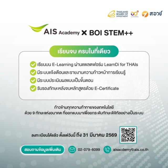 AIS Academy ร่วมกับสำนักงานคณะกรรมการส่งเสริมการลงทุน (BOI) เปิดโครงการ AIS Academy x BOI STEM++ มอบสิทธิพิเศษให้ภาคธุรกิจ คนไทย และบัณฑิตจบใหม่ เรียนรู้ทักษะด้าน STEM (Science, Technology, Engineering, Mathematics) และทักษะดิจิทัลแห่งอนาคตแบบเจาะลึก 9 หลักสูตร ฟรี ยกระดับขีดความสามารถของบุคลากรทุกกลุ่มอุตสาหกรรม ปูทางสู่การเติบโตในเศรษฐกิจดิจิทัลของประเทศ
