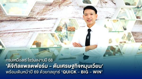 นายอดิทัต วะสีนนท์ อธิบดีกรมอุตสาหกรรมพื้นฐานและการเหมืองแร่ (กพร.)เปิดเผยว่า กรมจะดำเนินแนวทางนโยบาย QUICK BIG WIN เร่งผลลัพธ์ใน 1 ปี โดย QUICK ปรับลดขั้นตอน เร่งรัดการอนุญาตด้วย Digital License Platform ให้ขออาชญาบัตรสำรวจแร่ ประทานบัตรทำได้รวดเร็ว โปร่งใส ติดตามสถานะออนไลน์ BIG ปรับโครงสร้างเศรษฐกิจระยะยาว ส่งเสริม เศรษฐกิจหมุนเวียน และ ปรับเปลี่ยนเศรษฐกิจ สังคมให้เป็นมิตรต่อสิ่งแวดล้อมและยั่งยืน (Green Transformation) ลงทุนโครงสร้างพื้นฐาน ระบบนิเวศอุตสาหกรรมครบวงจร WIN เชื่อมโยงแร่สู่กระบวนการผลิตของอุตสาหกรรมต่อเนื่อง เช่น ยานยนต์ EV พลังงานสะอาด เซมิคอนดักเตอร์ และกลุ่มโครงสร้างพื้นฐาน เพื่อสร้างงาน การลงทุน การเติบโตร่วมกัน
