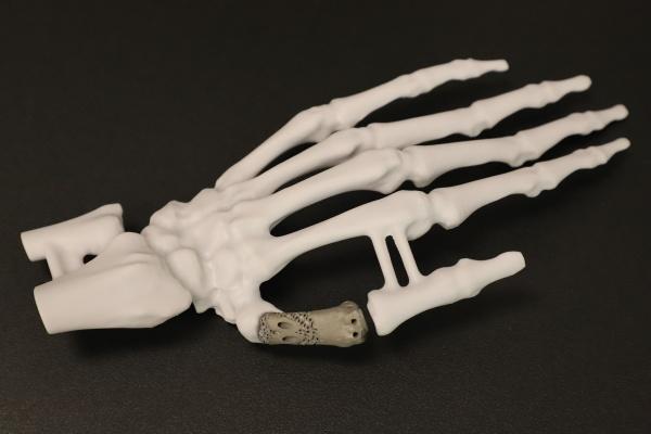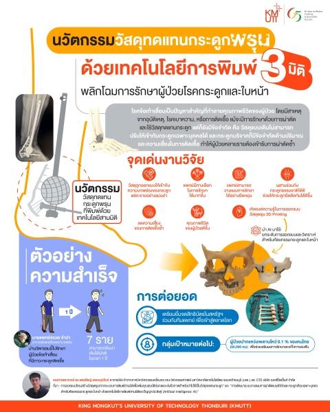 มหาวิทยาลัยเทคโนโลยีพระจอมเกล้าธนบุรี (มจธ.) เปิดตัวนวัตกรรมวัสดุทดแทนกระดูกพรุนพิมพ์ด้วยเทคโนโลยีสามมิติ จากการออกแบบโครงสร้างวัสดุพรุนจากกระบวนการพิมพ์สามมิติ เพิ่มคุณสมบัติเชิงกลและเชิงชีวภาพสำหรับเป็นวัสดุทดแทนกระดูก พัฒนาระบบวางแผนการผ่าตัดแบบดิจิทัลและกระดูกเทียมเฉพาะบุคคล สำหรับศัลยกรรมกระดูกและใบหน้า ด้วยเทคโนโลยีการพิมพ์สามมิติและปัญญาประดิษฐ์ (Artificial Intelligence: AI) พัฒนาโดยทีมวิจัย มีรศ. ดร.พชรพิชญ์ พรหมอุปถัมภ์ อาจารย์ภาควิชาวิศวกรรมเครื่องกล คณะวิศวกรรมศาสตร์ มหาวิทยาลัยเทคโนโลยีพระจอมเกล้าธนบุรี (มจธ.) และ ผู้บริหารระดับสูงด้านเทคโนโลยีและนวัตกรรม (Chief Technology Officer : CTO) บริษัท ออสซีโอแล็บส์ จำกัด ธุรกิจที่แยกตัว (Spin-off) ของ มจธ. เป็นหัวหน้าโครงการฯ เป็นการบุกเบิกในวงการศัลยกรรมกระดูก นวัตกรรม เพื่อแก้ไขข้อจำกัดการรักษาแบบดั้งเดิม โดยเฉพาะปัญหาการติดเชื้อซ้ำสูง ช่วยให้กระดูกของผู้ป่วยยึดติดกันได้ดี มีความแม่นยำทางกายวิภาคของวัสดุทดแทนกระดูกที่ใช้กันทั่วไปจากเดิมที่ใช้ กระดูกบริจาคหรือซีเมนต์ทางการแพทย์