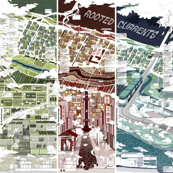 Rooted Currents เป็นงานที่เกิดจากการรวมตัวของอาจารย์ Assoc. Prof. Dr. Martin Schoch และ นักศึกษา 12 คน ประกอบด้วย ภัณฑิรา อาจารีพิพัฒน์, อมรพงศ์ อัศวพงษ์พูลกิจ, ปราญชลี อัชฌาสุทธิคุณ, Mia Clarisse Ignacio, May Thet Khaing, สราภัทร คุ้มคง, นิรชา ลิ้มสิริสกุล, กอไผ่ นนทเปารยะ, Ei Thandar Oo, ณัฏฐภพ วิลาวัณย์วจี, ภาณุรัสมิ์ วงษ์ตรี และ พฤกษ์ณพล ทองใบ ที่นำโจทย์จริงของเมืองกวางโจว สาธารณรัฐประชาชนจีน มาออกแบบผังเมืองใหม่ที่อยู่ร่วมกับน้ำได้อย่างสมดุล