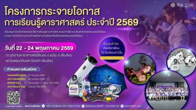 สถาบันวิจัยดาราศาสตร์แห่งชาติ (องค์การมหาชน) (สดร.) (NARIT) กระทรวงการอุดมศึกษา วิทยาศาสตร์ วิจัย และนวัตกรรม (อว.) ชวนโรงเรียนทั่วประเทศสมัครเข้าร่วมโครงการกระจายโอกาสการเรียนรู้ดาราศาสตร์ ประจำปี 2569 เพื่อรับมอบกล้องโทรทรรศน์ชนิดดอปโซเนียน และสื่อการเรียนรู้ดาราศาสตร์ ฝึกอบรมการใช้งานฟรี เปิดรับสมัครตั้งแต่บัดนี้ ถึง 21 เมษายน 2569 ทาง