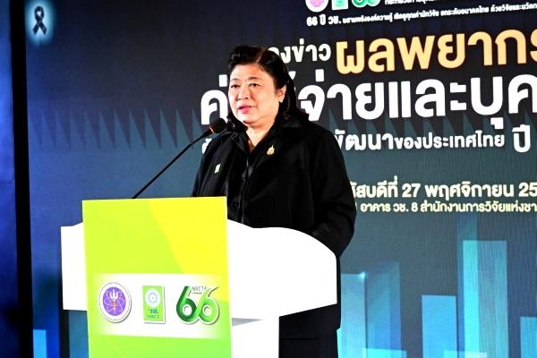 ดร.วิภารัตน์ ดีอ่อง ผอ.สำนักงานการวิจัยแห่งชาติ(วช.) แถลงผลพยากรณ์ค่าใช้จ่ายและบุคลากรด้านการวิจัยและพัฒนาของประเทศไทย ปี 2567 – 2568 ณ ศูนย์สารสนเทศกลางด้านวิทยาศาสตร์ วิจัยและนวัตกรรมของประเทศ อาคาร วช. 8 ภายในงาน NRCT Forum 2025 วันคล้ายวันสถาปนา วช. ครบรอบ 66 ปี เมื่อวันที่ 27 พฤศจิกายน 2568