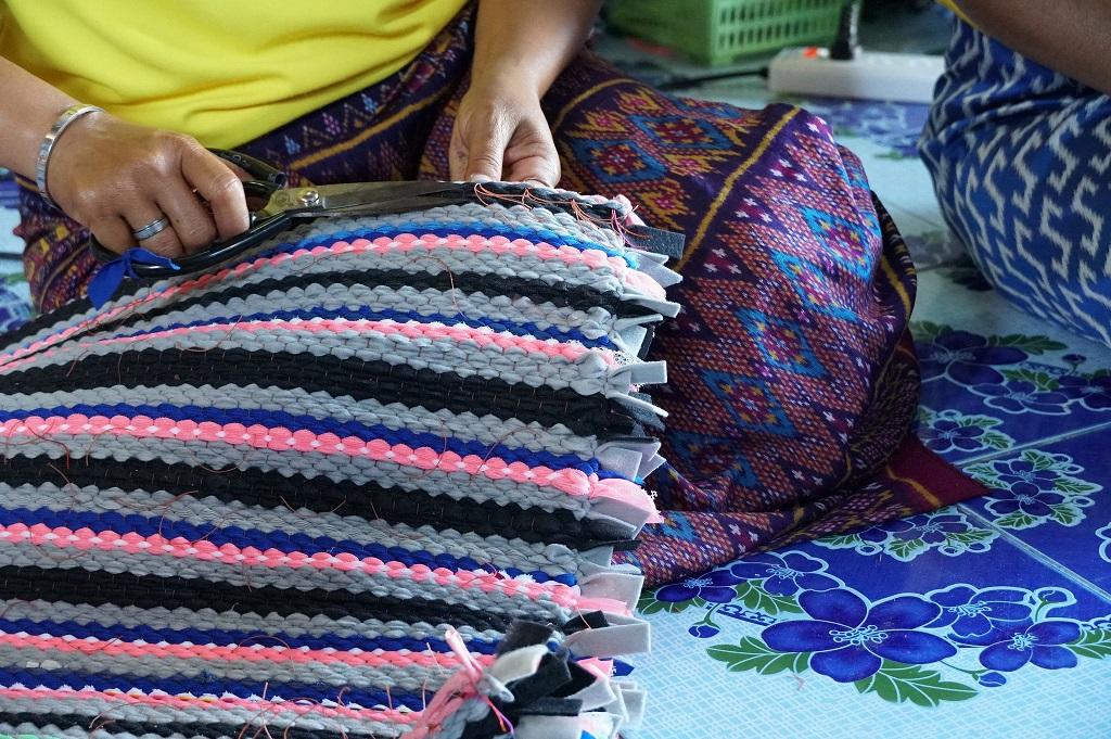 จากชุมชนเกษตรกรรมสุรินทร์ รายได้น้อย ไม่มีอาชีพเสริม ชัชวาลย์ บุสยาตรัส วิสาหกิจชุมชนพรมเช็ดเท้า บ้านตรึม อ.ศีขรภูมิ จ.สุรินทร์ นำเศษผ้าสำลีเหลือใช้จากโรงงานผ้า 2-3 แห่ง ผลิตพรมเช็ดเท้า ที่หนา นิ่ม ซักง่าย เป็นช่องทางเสริมอาชีพกับชุมชนและลดขยะจากเศษผ้า