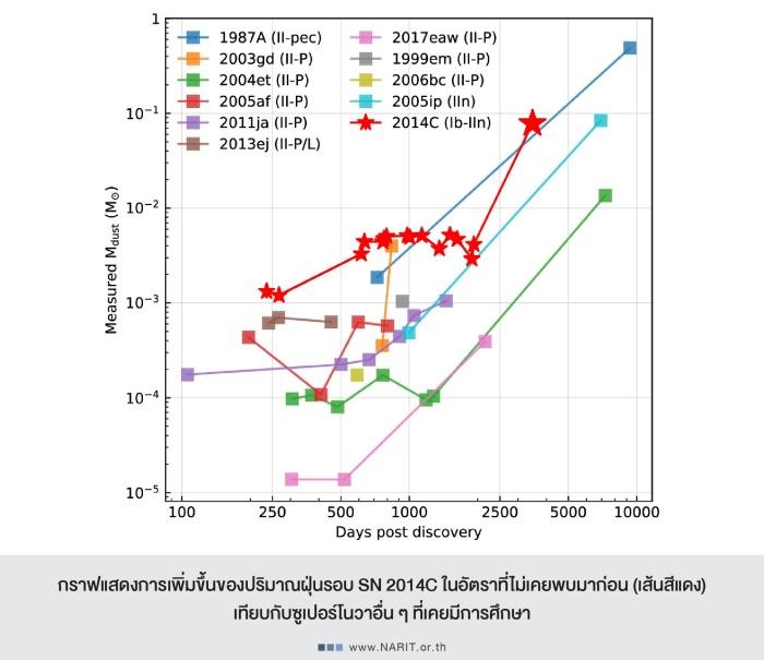 ดร. สมาพร ติญญนนท์ นักวิจัยด้านจักรวาลวิทยาและฟิสิกส์ดาราศาสตร์พลังงานสูง สถาบันวิจัยดาราศาสตร์แห่งชาติ (องค์การมหาชน) หรือ NARITเปิดเผยว่าการสังเกตการณ์ ซูเปอร์โนวา 2014C (SN2014C) ด้วยกล้องโทรทรรศน์อวกาศเจมส์เว็บบ์ พบมวลสารจากการระเบิดยังมีปฏิกิริยากับมวลสารไฮโดรเจนที่ล้อมรอบ แม้การระเบิดซูเปอร์โนวาจะผ่านไปแล้วเกือบหนึ่งทศวรรษ ทั้งพบปริมาณฝุ่นรอบดาวฤกษ์เพิ่มขึ้นเป็นจำนวนมาก มีมวลมากกว่าโลก 20,000 ดวง นับเป็นปริมาณฝุ่นจากซูเปอร์โนวามากที่สุดเท่าที่เคยตรวจพบ เพิ่มมากขึ้นกว่า 10 เท่า เมื่อเทียบกับปริมาณฝุ่นเดิมที่วัดได้จากการศึกษาด้วยกล้องโทรทรรศน์อวกาศสปิตเซอร์ ในปี 2019