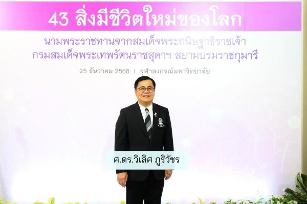 ศ.ดร.วิเลิศ ภูริวัชร์ อธิการบดีจุฬาลงกรณ์มหาวิทยาลัย แถลงข่าวการค้นพบสิ่งมีชีวิตใหม่ของโลกในประเทศไทยจำนวน 43 ชนิด ซึ่งได้รับพระราชทานชื่อวิทยาศาสตร์ภายใต้พระนามของสมเด็จพระขนิษฐาธิราชเจ้า กรมสมเด็จพระเทพรัตน์ราชสุดาฯสยามบรมราชกุมารีเนื่องในโอกาสมหามงคลเฉลิมพระชนมายุ 70 พรรษาพุทธศักราช 2568 ว่าเป็นของขวัญปีใหม่สำหรับคนไทยสะท้อนถึงศักยภาพของนักวิจัยไทยและความอุดมสมบูรณ์ด้านความหลากหลายทางชีวภาพของประเทศ เป็นองค์ความรู้ทางวิทยาศาสตร์ที่เป็นประโยชน์ต่อสาธารณชน เป็นหลักฐานประกาศถึงความก้าวหน้าของงานวิจัยด้านอนุกรมวิธานและความหลากหลายทางชีวภาพของประเทศ